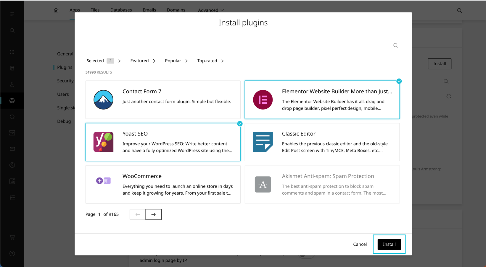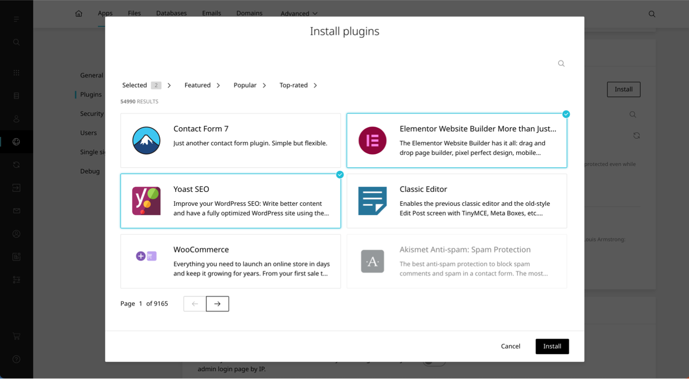 The Enhance WordPress toolkit provides a plugin manager that alllows users to install, activate/deactivate, update and delete WordPress plugins from within the Enhance control panel.