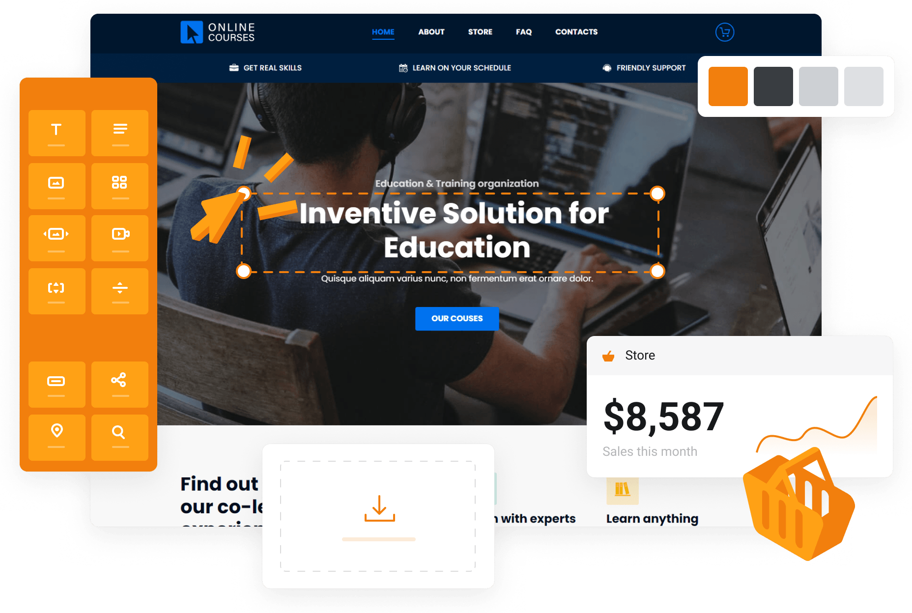 You can use ready-made layout elements like text, buttons, photos, or icons to build any custom professional website layout.